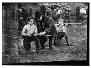 Boy Scouts learning to shoot. Two boys kneeling on ground with the instuctor between.