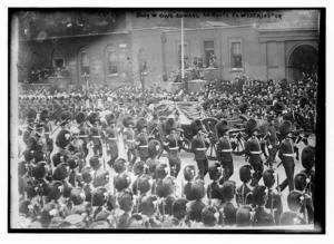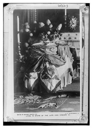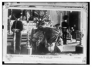 Lying in state of the Late King Edward VII. Guarded by grenadiers.