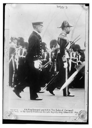 H.M. King George V and H.R.H. the Duke of Cornwall in the funeral procession of the Late King Edward VII