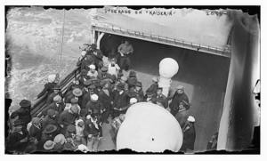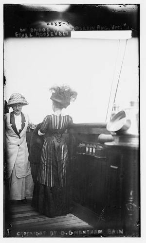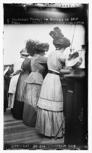 Roosevelt on bridge of ship; Ethel, Mrs. Roosevelt, Mrs. Longworth