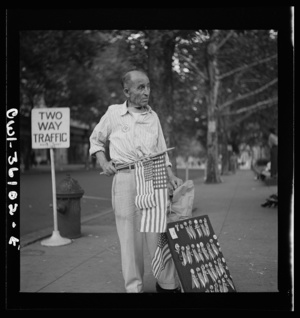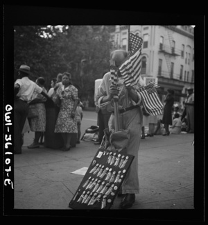 Washington, D.C. A man selling flags and buttons at the parade to recruit civilian defense volunteers