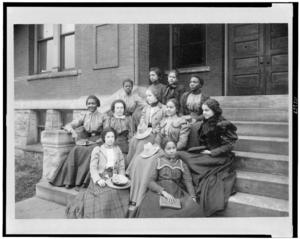 Nine African American women, full-length portrait, seated on steps of a building at Atlanta University, Georgia