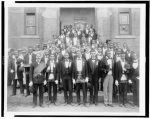 African American men posed at entrance to building, some with derbys and top hats, and banner labeled "Waiters Union" in Georgia