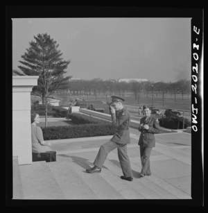 Washington, D.C. Sailor taking pictures on the steps of the National Gallery of Art on a Sunday afternoon. The Capitol is in the background