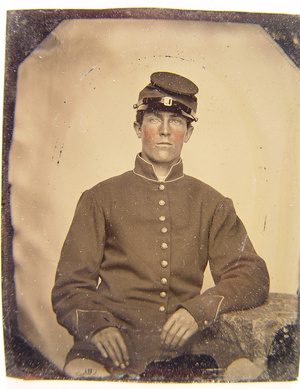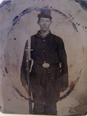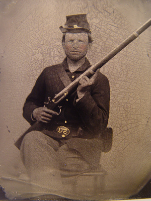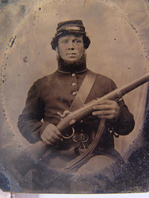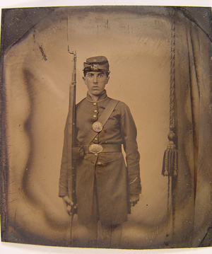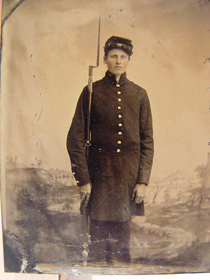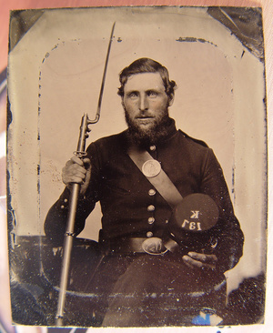 Unidentified soldier in Union uniform and Company K, 137th regiment forage cap with bayoneted musket