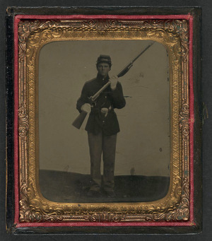 Unidentified soldier in Union uniform with musket, bayonet, and cartridge box
