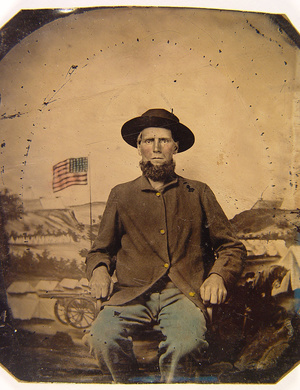 Unidentified soldier in Union uniform in front of painted backdrop showing military camp