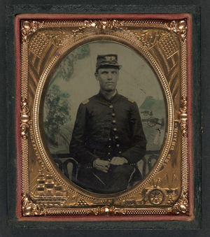 Unidentified soldier in Union frock coat and forage cap with bayoneted musket in front of painted backdrop showing fort and landscape