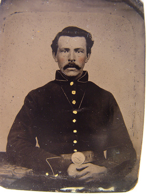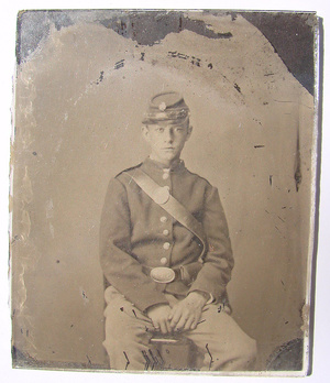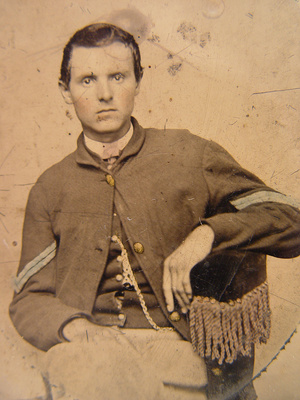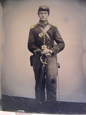 Unidentified soldier in Union cavalry uniform and shoulder scales with saber
