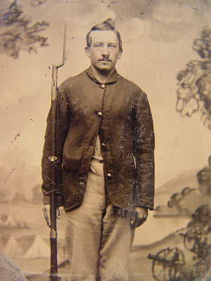 Unidentified soldier in Union sack coat with bayoneted musket in front of painted backdrop showing military camp