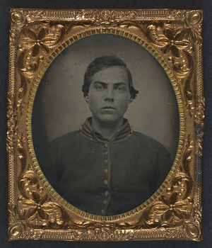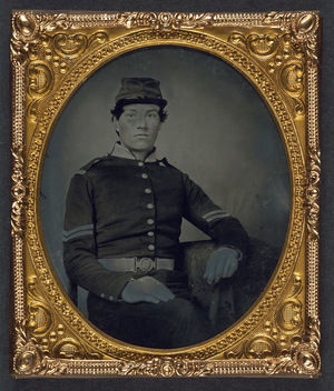 Unidentified soldier in Union frock coat and forage cap with bayoneted musket and cap box in front of painted backdrop showing curtain