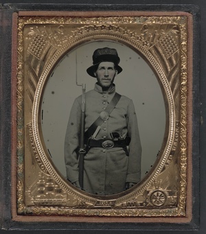 Unidentified soldier in Confederate uniform with musket and D-guard Bowie knife