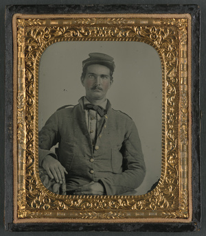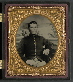 Private Jonathan Colgrove of Co. F, 57th Pennsylvania Infantry Regiment, in uniform in front of painted backdrop showing column base and landscape