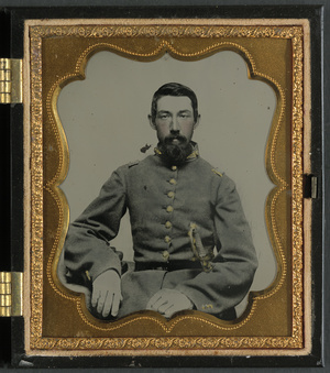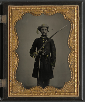 Unidentified soldier in Confederate uniform and derby hat with sword