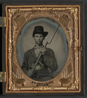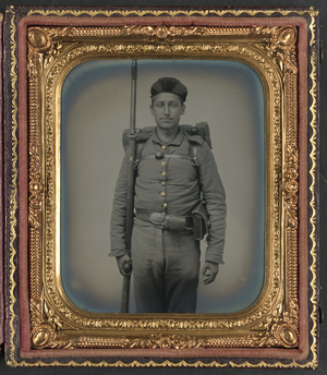 Unidentified soldier in Ohio Volunteer Militia uniform with bedroll and musket