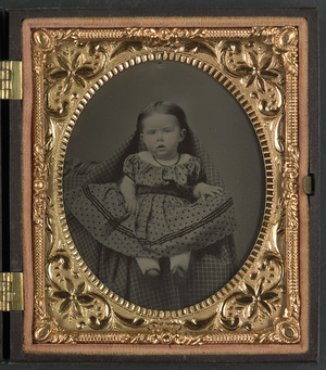 Private Hiram L. Barrett of Co. K, 7th Connecticut Infantry Regiment in uniform with bayoneted musket, and nine-month-old girl, Marrie