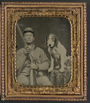 Unidentified soldier in Confederate uniform with shotgun sitting next to dog