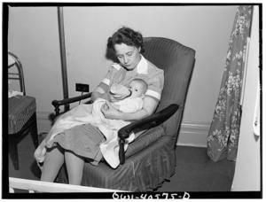 Washington, D.C. A volunteer worker feeding a baby at the nursery of the United Nations service center