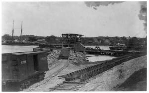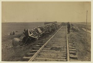 Remains of wreck on the track, ready for transportation to Alexandria. This train was thrown from the track by the Rebels