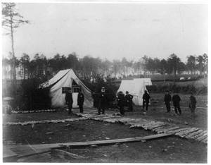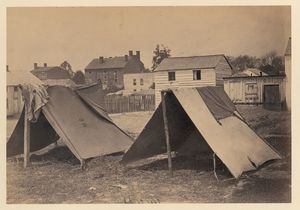 Covered wagon for "Headquarters baggage" and saddlery, probably a Civil War military camp