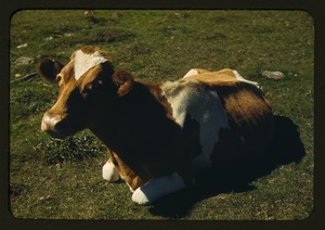 Guernsey cow or calf lying on the ground