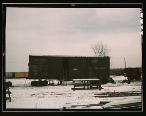 Painting a car at the repair or "rip" tracks at North Proviso(?), C & NW RR., Chicago, Ill.