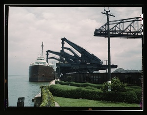 Pennsylvania R.R. ore docks, unloading iron ore from a lake freighter by means of "Hulett" unloader, Cleveland, Ohio