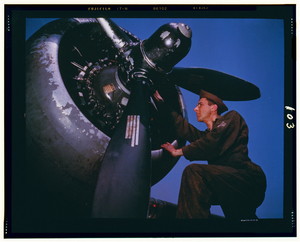 Mounting motor on a Fairfax B-25 bomber, at North American Aviation, Inc., plant in Inglewood, Calif.