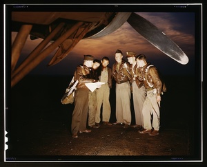 Here's our mission. A combat crew receives final instructions just before taking off in a mighty YB-17 bomber from a bombardment squadron base at the field, Langley Field, Va.