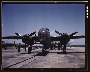 New B-25 bombers lined up for final inspection and tests at the flying field of an aircraft plant, North American Aviation, Inc., Calif. It performs at the 25,000-foot ceiling