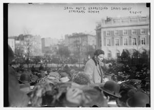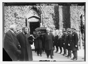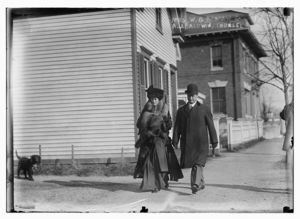 Mrs. W.G. Brokaw and her counsel A.J. Baldwin walking on sidewalk