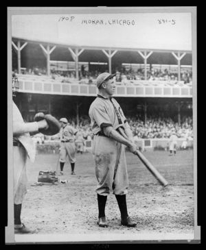 Patrick Joseph Moran, Chicago NL baseball player, standing at home plate with bat in hand during baseball game