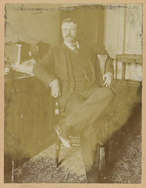 Theodore Roosevelt, three-quarter length portrait, seated in front of desk with legs crossed