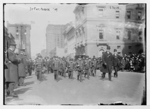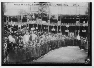 Pupils of school & group of anti-royalists, Tabriz, Persia Large group of uniformed children with adults in rear; large balconied building with striped columns in background
