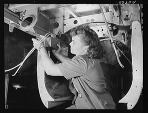 Inside the fuselage of a North American P-51 fighter, this woman employee assembles an electrical switch box