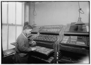 Horace Lindfors, 14 year old printers helper, sizing up leads for Riverside Press, First Av., N.Y. City. L.W. Hine, Feb. 1917. Location: New York, New York (State)