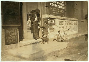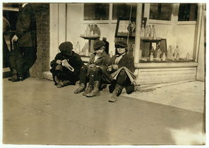 Passing away the time on the corner. 2 are 9 years old and started out at 5 a.m., 1 is 10 years old and started out later. Location: Oklahoma City, Oklahoma / Lewis W. Hine.