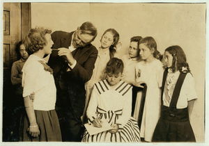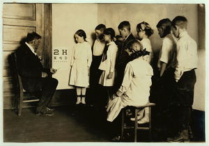 Medical inspection and testing eyes in Grade 5 of Washington School. Location: Lawton, Oklahoma / Lewis W. Hine.
