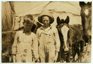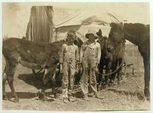 A pair of truants, tending their father's mules. Photo taken during school hours, near Oklahoma City. Boys are 9 and 11 yrs. old. Location: Oklahoma City, Oklahoma. / L.W. Hine.