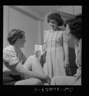 Arlington, Virginia. Three residents of Idaho Hall, Arlington Farms, a residence for women who work in the U.S. government for the duration of the war, admiring a photograph of a friend. Each girl has a different picture of him in her collection