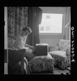 Arlington, Virginia. An older resident reading the paper and listening to the radio in her room at Idaho Hall, Arlington Farms, a residence for women who work in the U.S. government for the duration of the war