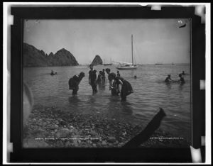 Hotel Metropole, beach and swimmers, Avalon, Catalina Island, Calif.