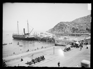 Steamship at pier by boardwalk, Avalon, Catalina Island, Calif.