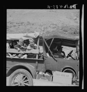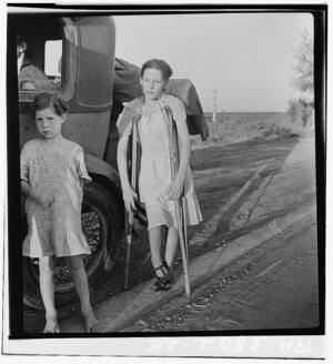 Children of Oklahoma drought refugees on highway near Bakersfield, California. Family of six; no shelter, no food, no money and almost no gasoline. The child has bone tuberculosis