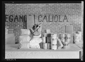 The commodities on the counter represent two weeks allotment for four people. Photograph made in Farm Security Administration (FSA) distributing station for emergency grants of food and clothing to destitute agricultural workers. Bakersfield, California