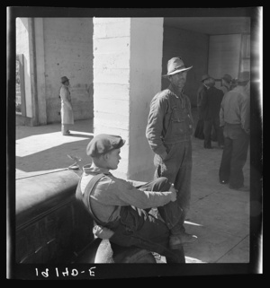 Calipatria, Imperial Valley. Idle pea pickers discuss prospects for work. California