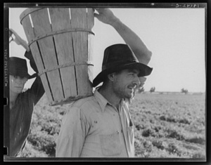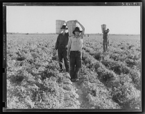 Pickers coming into the weigh master. Pea field near Calipatria, California
