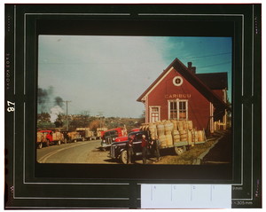 Trucks outside of a starch factory, Caribou, Aroostook County, Me. There were almost fifty trucks in the line. Some had been waiting for twenty-four hours for the potatoes to be graded and weighed