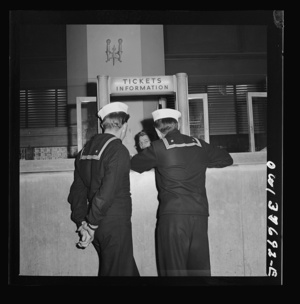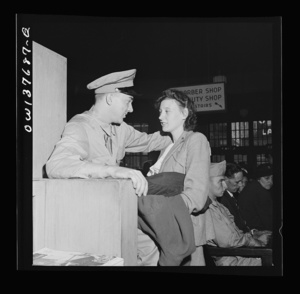 Chicago, Illinois. Private D.N. Danielson, stationed in North Carolina, and Mrs. Danielson, from Minnesota, in the waiting room of the Greyhound bus terminal. They met in Chicago to save time for his furlough