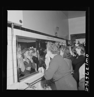 Chicago, Illinois. Bus passengers in the Greyhound bus terminal's ladies' restroom. Items ranging from soap and nail polish to soda for upset stomachs may be rented from the maid on duty, who owns her own stock. Her business is usually very brisk